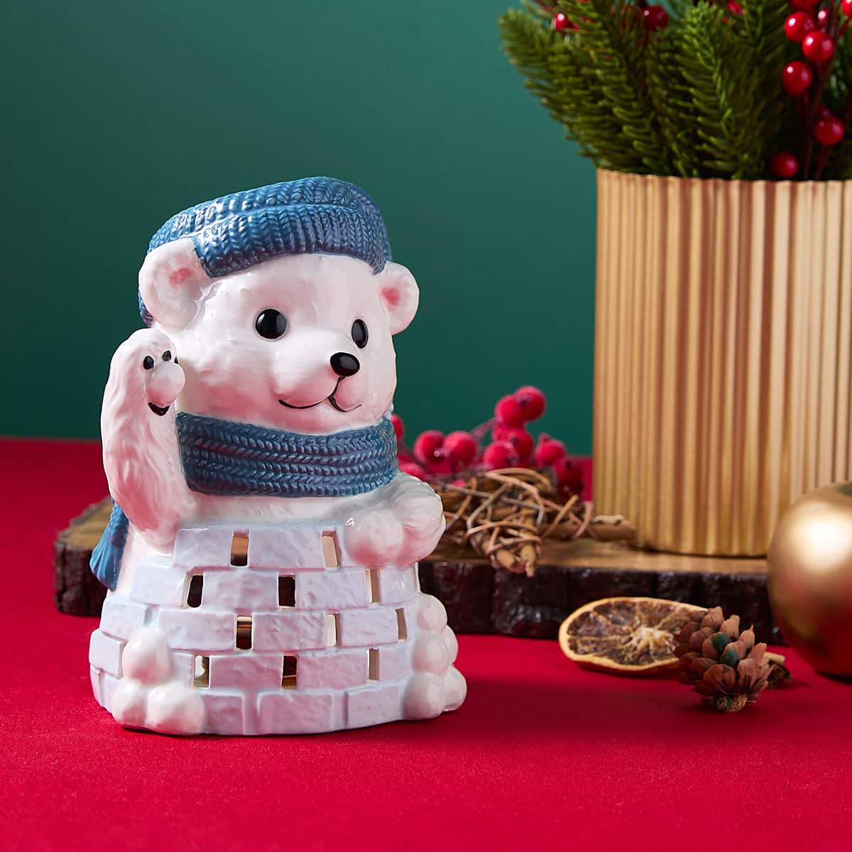 Bring a touch of winter whimsy to your home with this hand-painted tealight holder. Featuring a cheerful polar bear in a teal hat waving from behind a snowbrick igloo, this charming figure plays alongside the Winter Fun Snowman. A delightful addition to your seasonal décor, full of playful spirit and cozy glow.