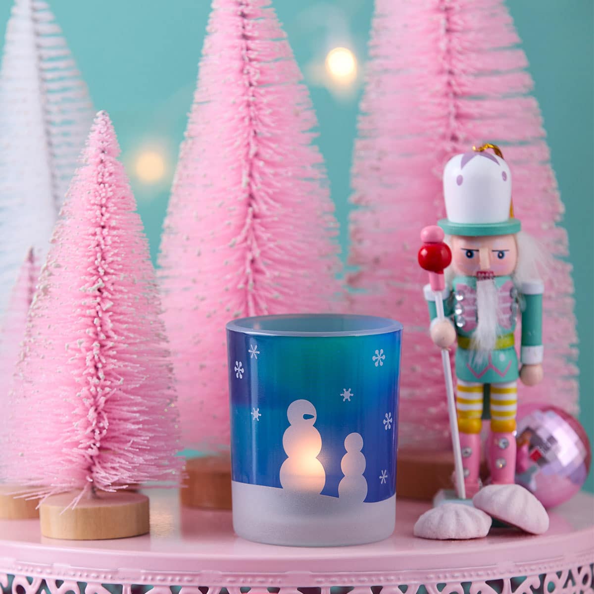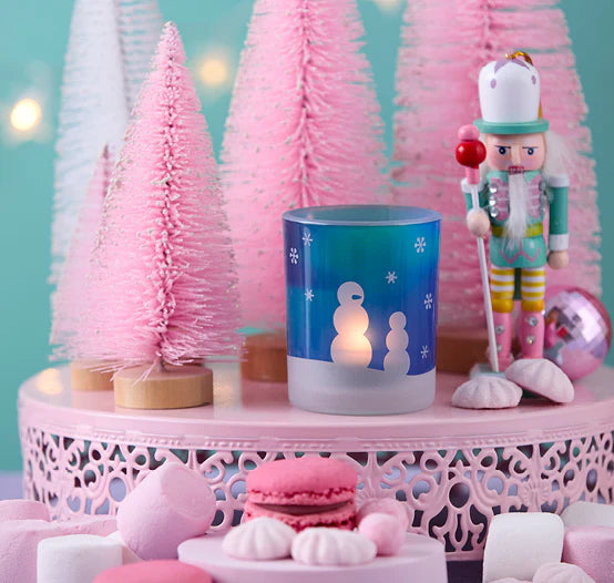 Capture the magic of a winter night with this beautifully decaled tealight holder. Featuring playful snowmen set against a snowy blue and green sky, the design comes to life when lit – casting a soft glow that evokes the wonder of the Aurora Borealis. A cozy, luminous accent for the season.