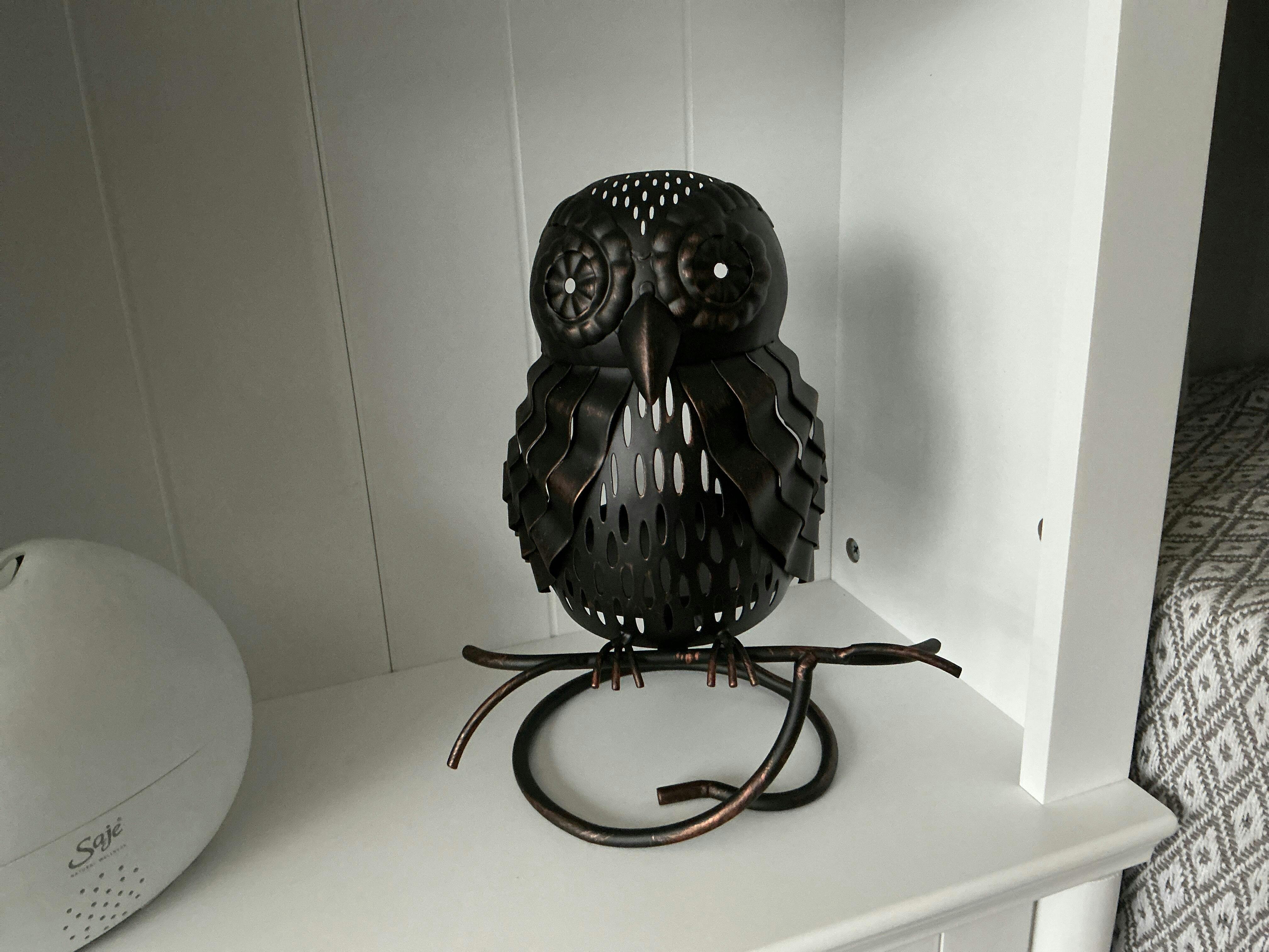 Bring the charm of the woodland into your home this season with this charming owl designed jar candle holder. In dark bronzed metal, your jar candle fits inside the owl's body and lets light shine through the cut-out holes.