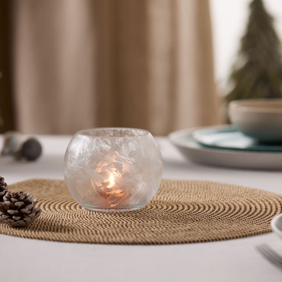 Crafted through a special process that creates a beautiful frosted ice finish, each piece is truly unique – no two are exactly alike. Delicate and refined, it should be handled with care to preserve its shimmering surface. Designed to pair seamlessly with the Crystalline Hurricane, this holder adds a soft, radiant glow to any setting – perfect for creating a serene, seasonal ambiance.