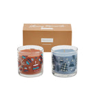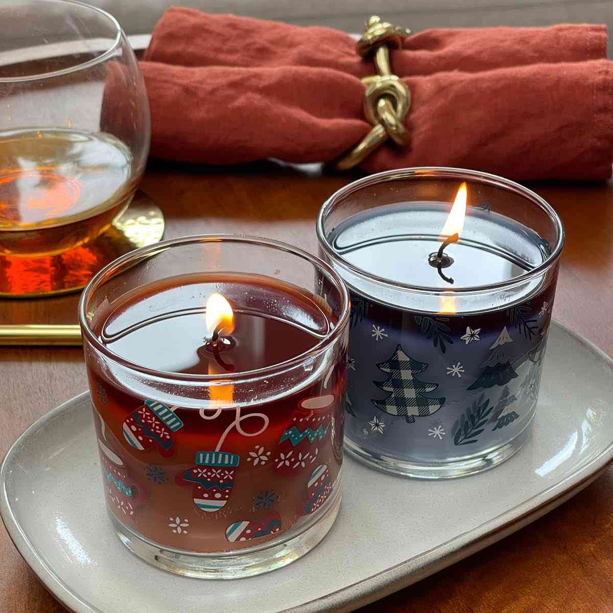 Wrap yourself in the warmth of seasonal scents when you light up this cozy pair of mini candle jars. Each glass jar has colored wax and decoration to match the fragrance inside. You will light up our wintery blends of Warm Flannel & Whiskey and Cashmere & Cocoa.