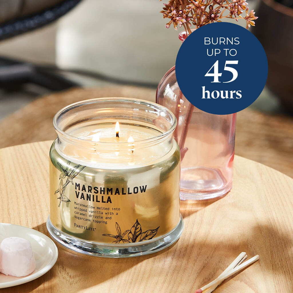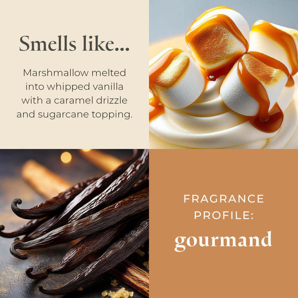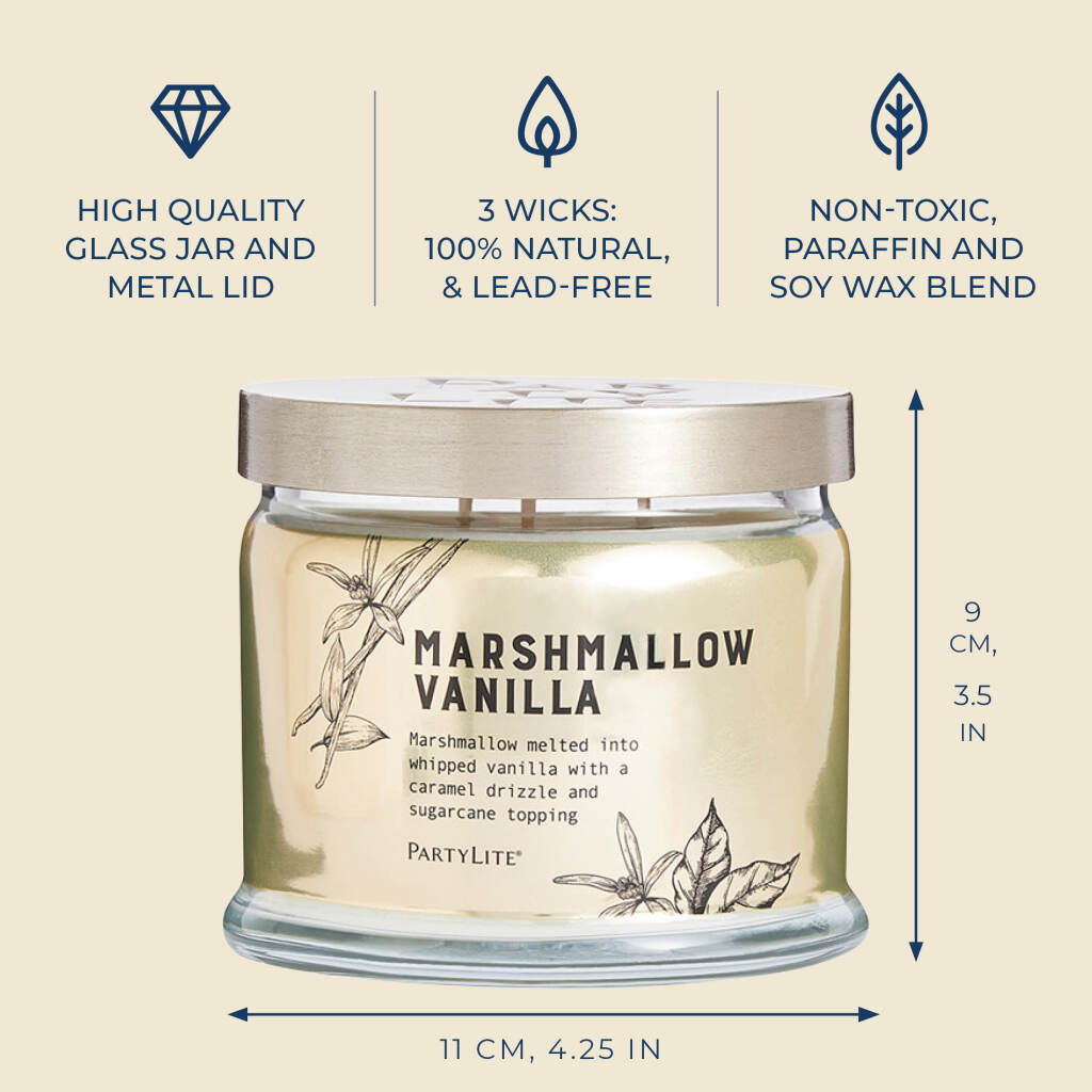 Marshmallow Vanilla is a blend of marshmallow and whipped vanilla melted with a caramel drizzle and sugarcane topping. Enjoy it in our premium fragrance form, the 3-Wick Jar Candle.*Due to sourcing challenges, the glass for our 3-Wick Jar Candles is being made by two different suppliers and may vary slightly in look. They still have the clean wax, and long burn-time you all love!