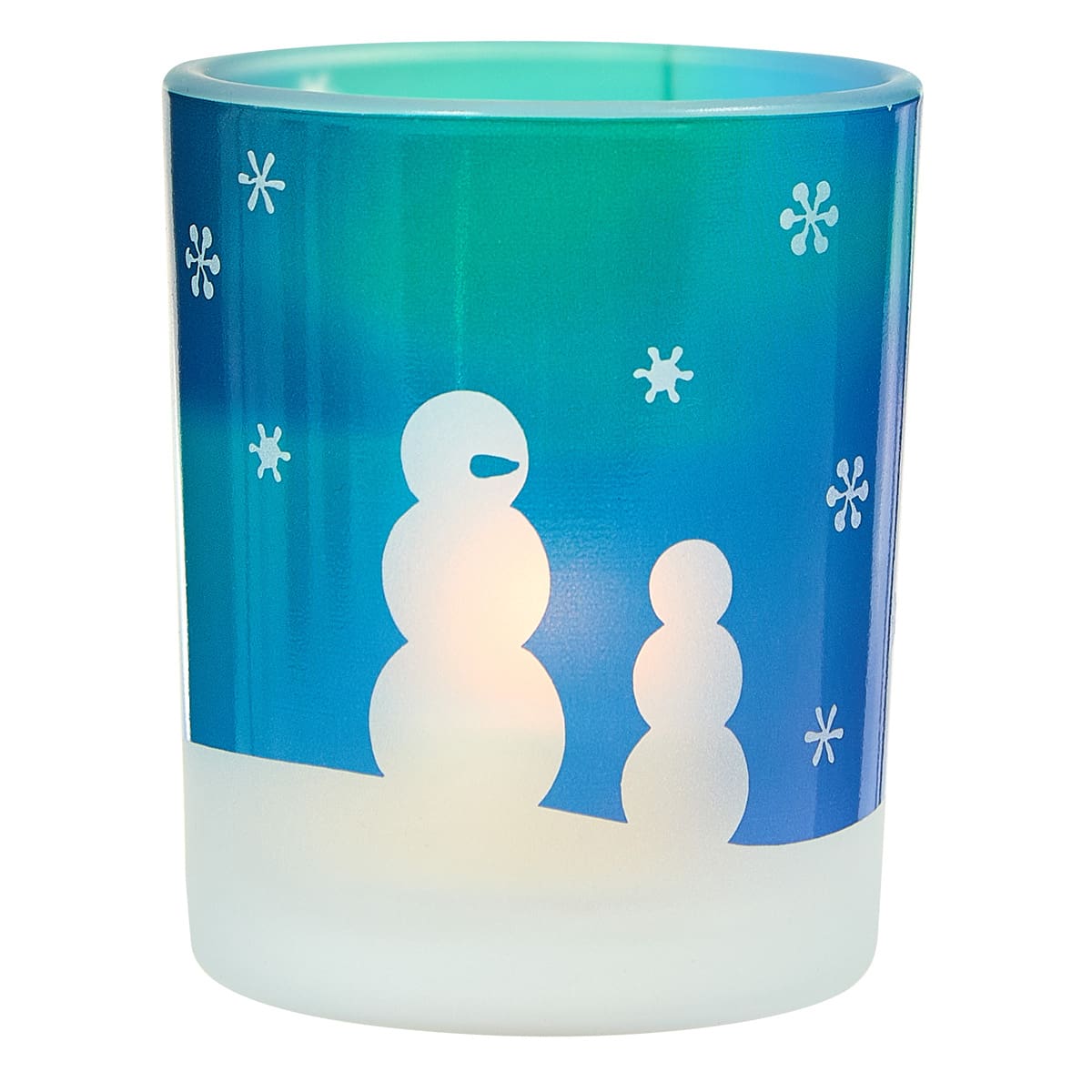 Capture the magic of a winter night with this beautifully decaled tealight holder. Featuring playful snowmen set against a snowy blue and green sky, the design comes to life when lit – casting a soft glow that evokes the wonder of the Aurora Borealis. A cozy, luminous accent for the season.