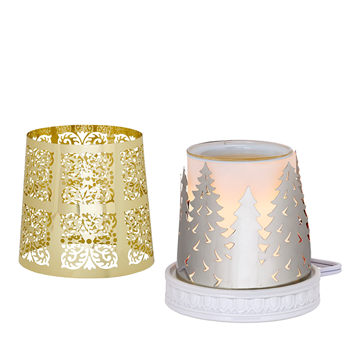 Change up your look to fit your mood with this Christmas wax warmer designed to work with your choice of fragranced wax melts. Place up to two ScentPlus® Heart Melts pieces into the dish, plug in and switch on the fragrance. With swappable sleeves featuring an ornate goldtone or fir tree pattern.