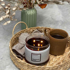 The velvety essence of tonka bean delicately balances the deeper, more robust notes of teakwood and the warm embrace of rum spirits. This intricately layered fragrance unfurls gracefully from this high-end 3-wick candle encased in an elegant glass jar.