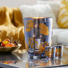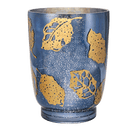 As whirling leaves dance in the wind across the design of this decorative hurricane holder, a silvery mercury interior finish amplifies the reflections of the candlelight inside. A blown glass holder with evening blue exterior, it also includes a metal tealight tree that lets you choose your favorite form and fragrance to match.