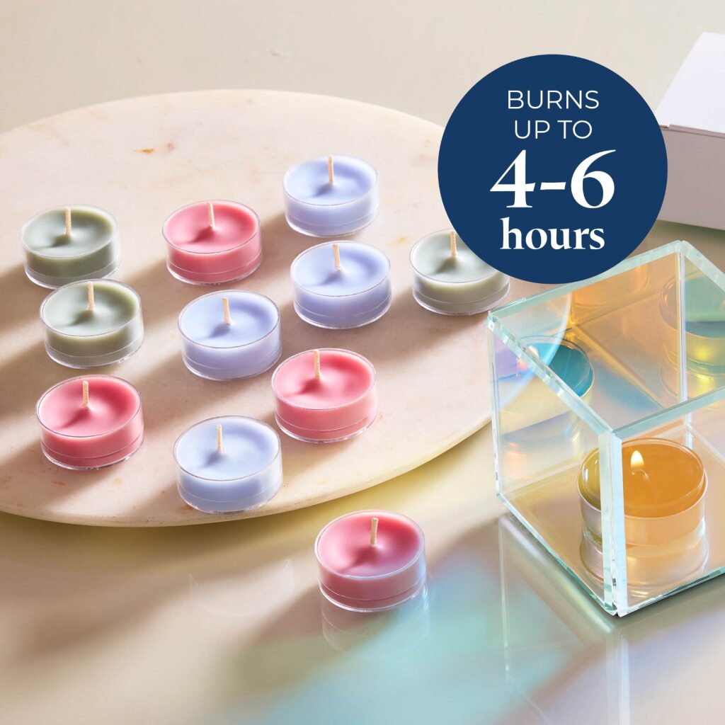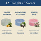 A winter filled with soulful fragrance and great memories is just around the corner. Find your new essential winter scent when you try a range in this 12 pack of tealight candles. Sample four tealights in each fragrance: Balsam Rose, Winter Morning and Snowflakes & Cotton.
